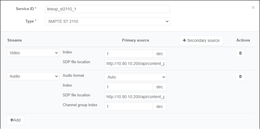 The lineup file describes a list of sources (including all the parameters needed to capture the source i.e. multicast address and port, input streams, …) to be used with the Media composer input (See Switch to Live use case). This configuration is unique per controller and is used by all the Live Encoder services.