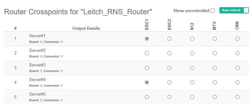 Select the Show uncontrolled checkbox to view the state of the entire router, including the inputs and outputs that have not been labelled or connected.