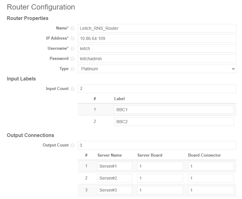 The output connections must be configured to map the router outputs to the input SDI ports of the encoder servers.
