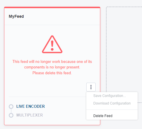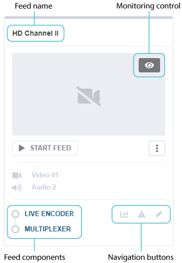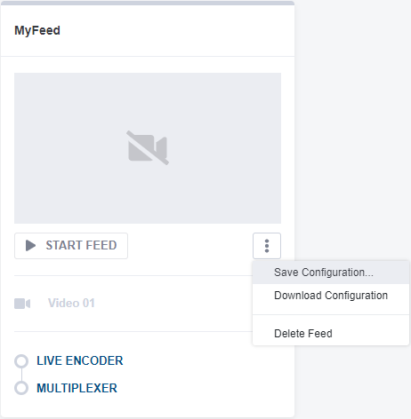 Enter a name for that feed then click the Add feed button. A new feed is displayed on the Home page. This feed has some basic predefined settings for Live Encoder and Multiplexer components, but you will need to complete and configure some parameters.