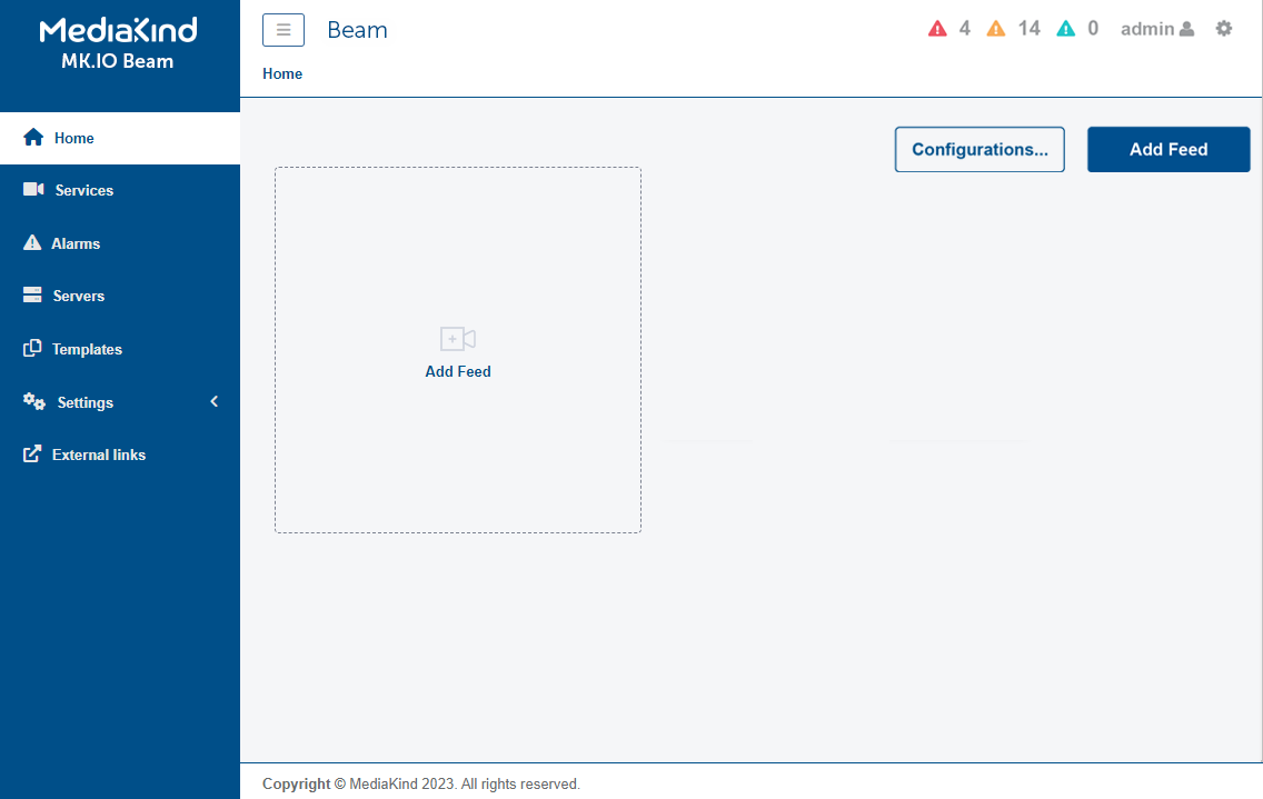The MK.IO Beam interface is designed for operators to simplify and accelerate feed configuration and control. The interface allows viewing all the running services as well as alarms and warnings in a single view. You can easily start or stop the services without navigating to the sub-menus.