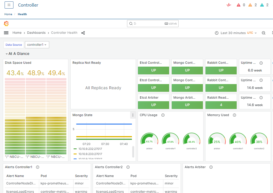 You can click the Health indicator or the Health left menu to display an embedded Grafana page showing an overview of Controller health.