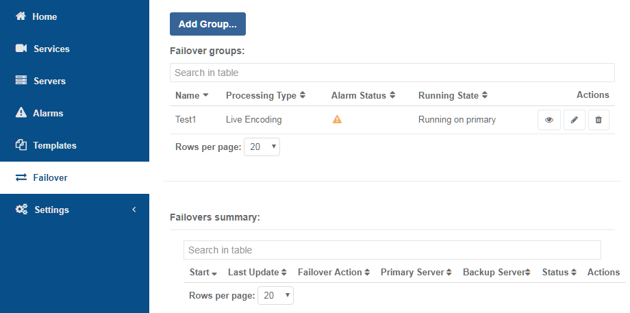 You can configure Failover settings and groups for redundant systems. Go to the Failover display table to view running states and alarm statuses.