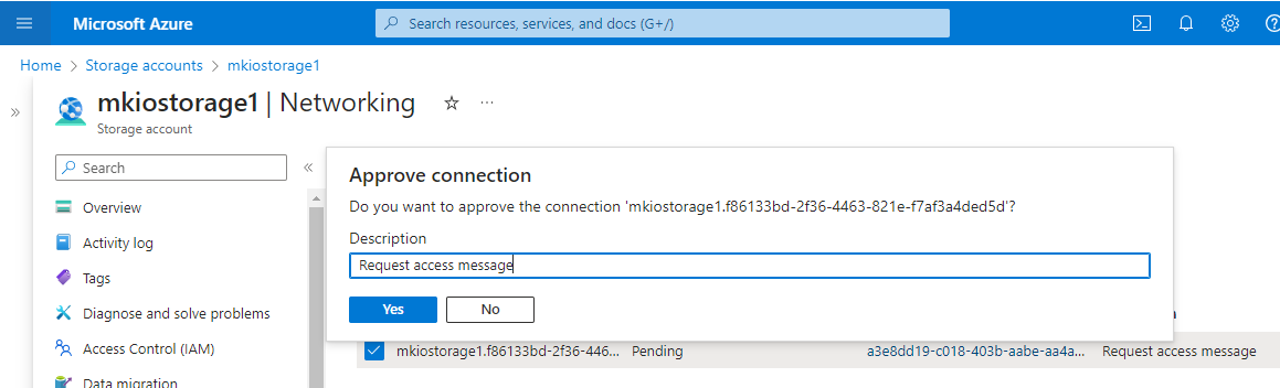 }Upon successful creation of the storage account, MK.IO will issue a request to the storage account and give the request message as the description of the connection request.