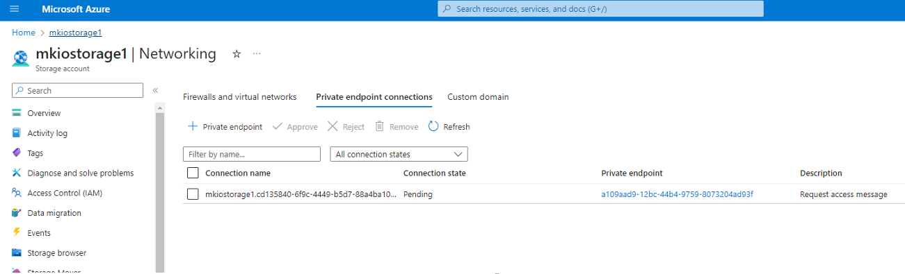 The request will remain pending until an explicit approval is done by the owner of the storage account in Azure. To list the pending connection requests, you will need to browse to the Networking configuration section of your storage account in Azure and open the Private endpoint connections tab as shown below: